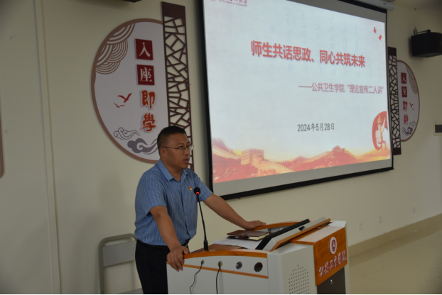 5月28日下午,英国365集团公司官网“理论宣传二人讲”在公司遇时学堂开讲。本次主讲人是公司党委书记张在金和公司团委副书记、食安22-1班员工冯诗雨,他们以“学习贯彻习近平总书记对公司思政课建设作出重要指示”为主题进行宣讲。公司党政领导,辅导员,党支部书记及研究生党支部、本科生党支部、心远社区员工第二党支部员工代表近百人参加宣讲会。公司党委副书记王红卫主持宣讲会。
