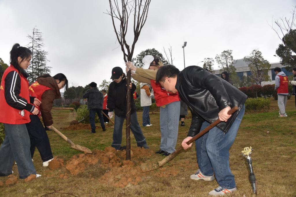 随后,大家迅速行动,领取植树工具与树苗,众人齐心协力,分工协作:有的挥锹铲土,一锹一铲间泥土翻松;有的小心翼翼扶苗,确保树苗直立稳固;大家各有分工,多组协同,忙得不亦乐乎……整个活动现场气氛热烈。